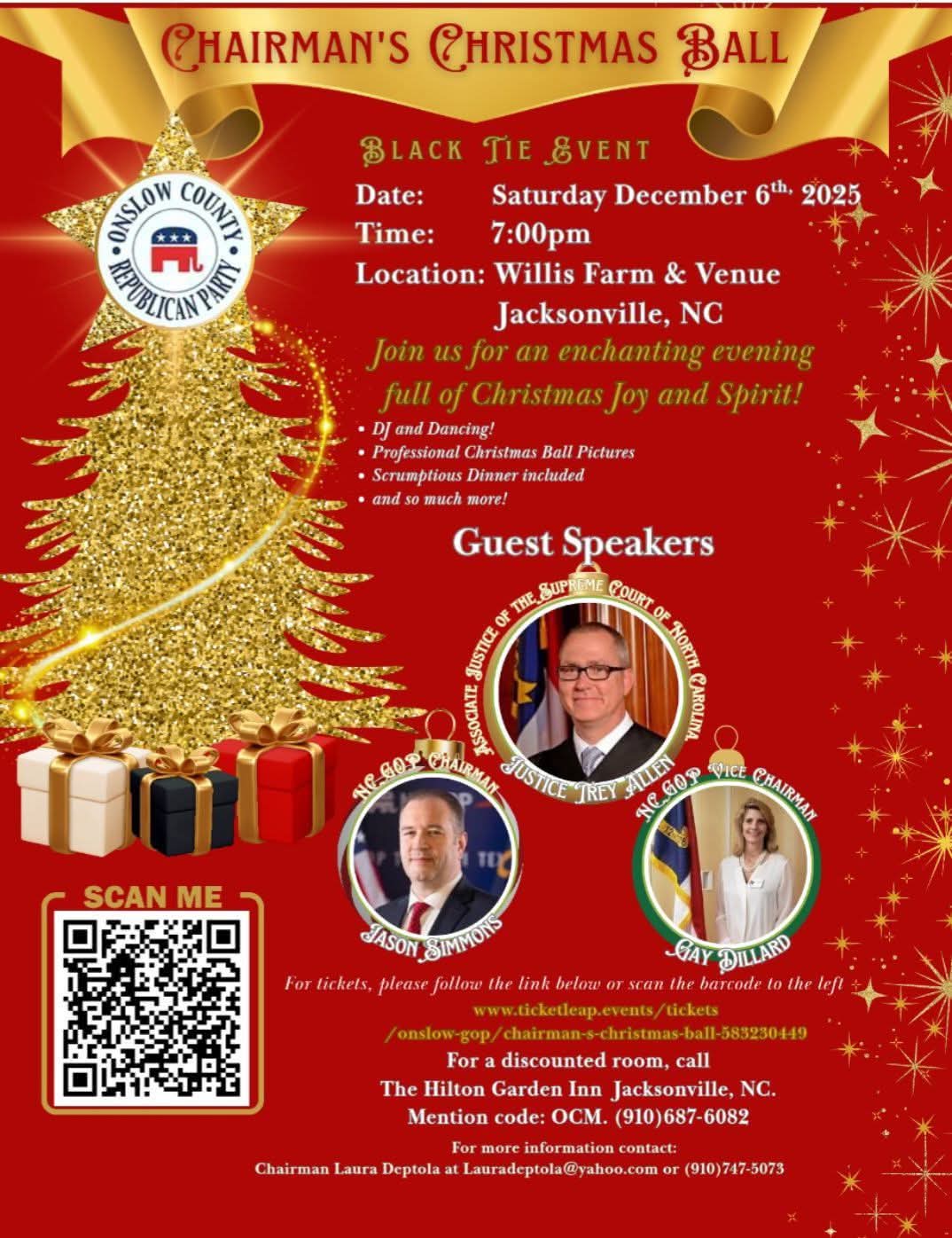 The Onslow County GOP is excited to announce that we will be hosting our first annual Chairman's Christmas Ball on Saturday December 6, 2025. This black-tie event will take place at 7:00 pm at the Willis Farm and Venue in Jacksonville, NC. There will be a VIP cocktail hour at 6:00 pm with our guest speaker for an additional charge.